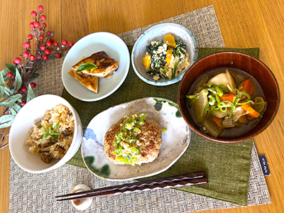 メニュー 鶏ごぼうごはん、うるおい鶏バーグ、春菊と柿の白和え、