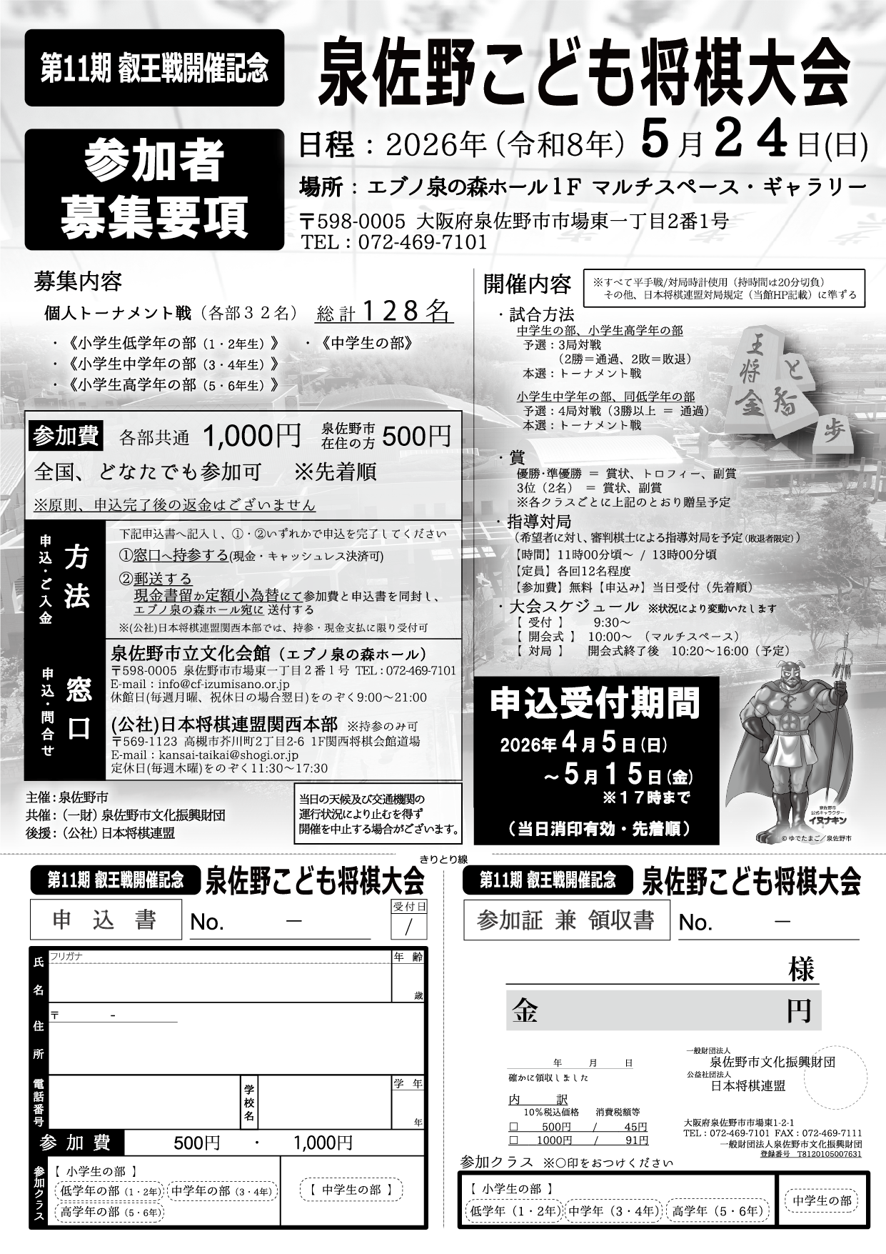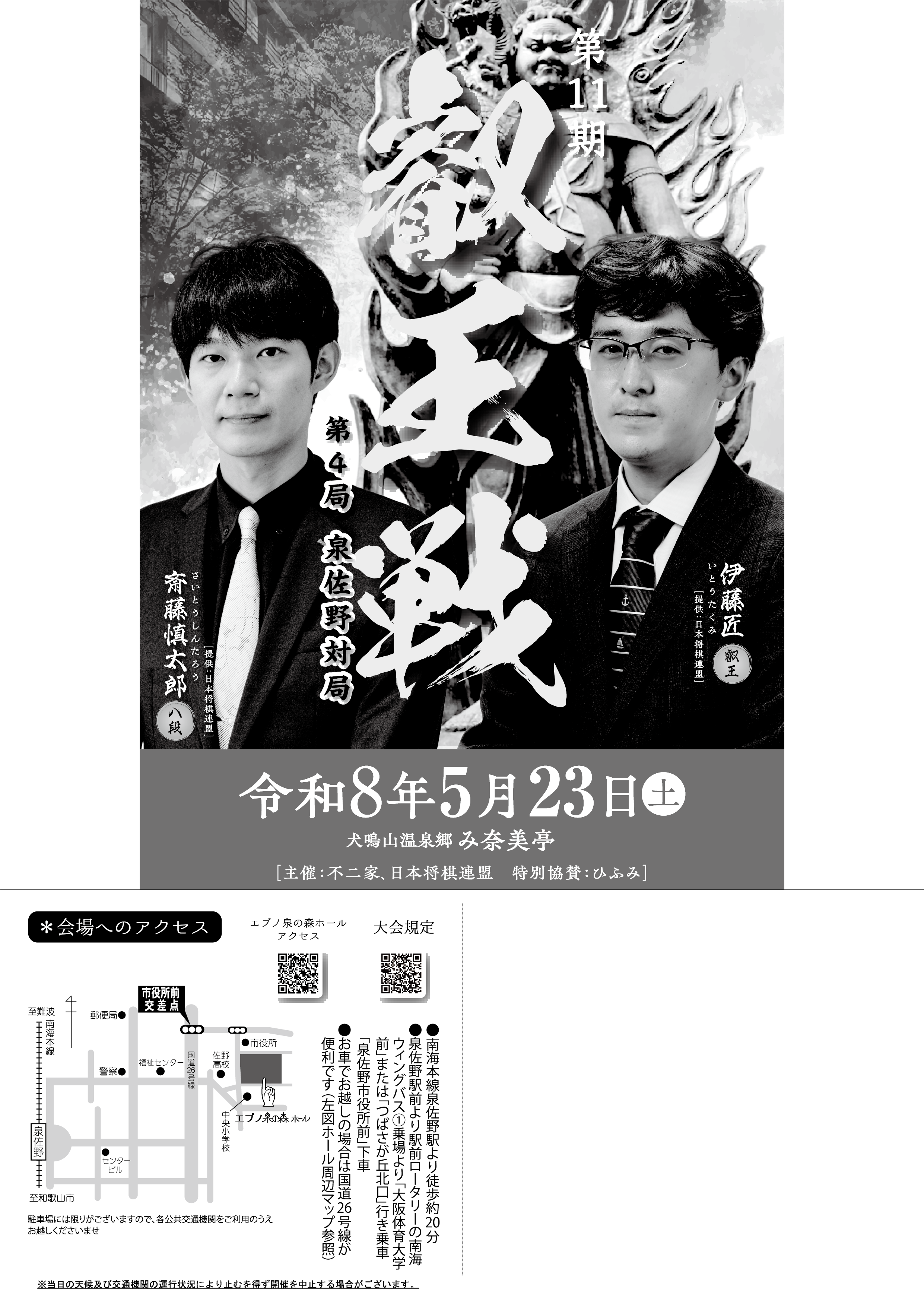 | 「第11期将棋叡王戦五番勝負」第4局が 泉佐野市で開催することが決定しました! これを記念し、来る5/24(日)に 【泉佐野こども将棋大会】 をエブノ泉の森ホールにて開催いたします。 |